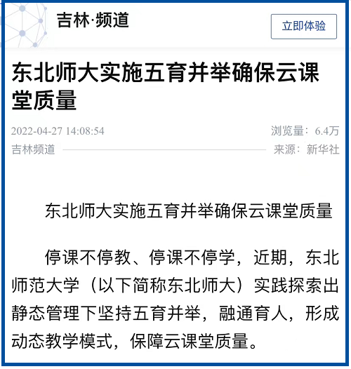 4月27日,新华社客户端以“东北师大实施五育并举确保云课堂质量”为题报道了我校在静态管理期间坚持五育并举,融通育人,形成动态教学模式,保障云课堂质量。附:相关报道链