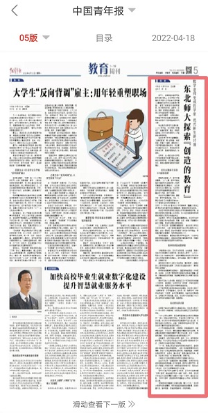4月18日,《中国青年报》第5版以“东北师大探索‘创造的教育’”为题,从深化学生对专业的理解、开展创造性示范课堂、花式新生研讨课三方面,对我校“创造的教育”理念引领下深化本科教育教学改革的经验和做法进行了深入报道。同时,《中国青年报》客户端也进行了报道。附:1.《中国青年报》报道2.《中国青年报》客户端报道