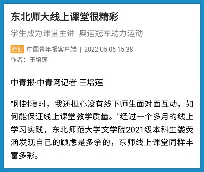 5月6日,中国青年报客户端以“东北师大线上课堂很精彩”为题,对我校“五育并举、融通育人”教学模式下开展的线上教学实践探索进行了深入报道。附:中国青年报客户端相关报
