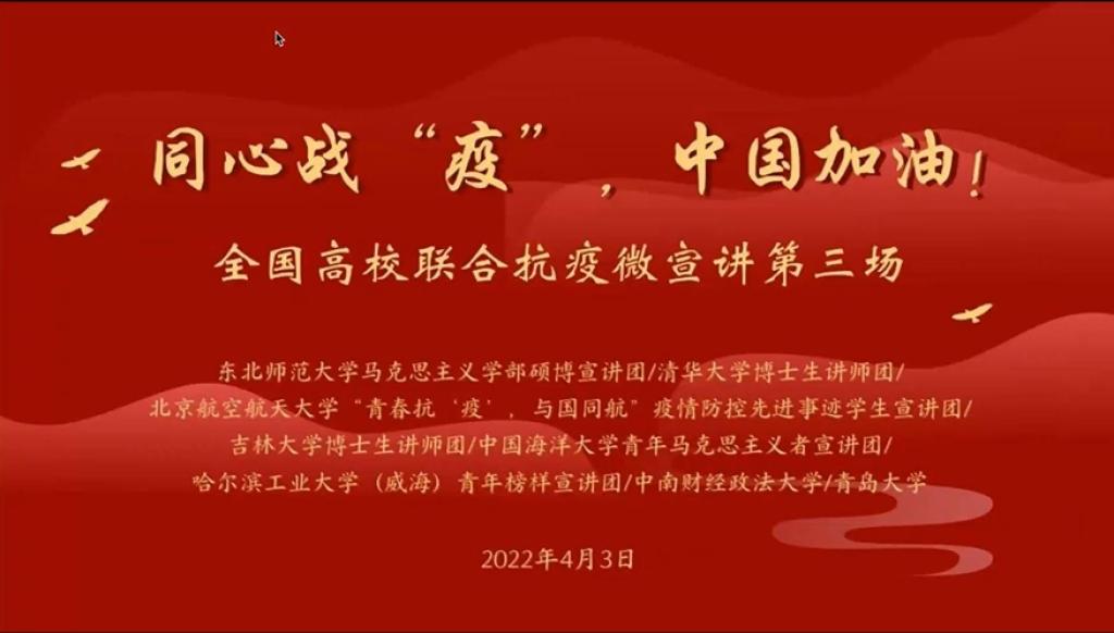4月3日,我校马克思主义学部联合清华大学、北京航空航天大学、吉林大学、中南财经政法大学、中国海洋大学、哈尔滨工业大学(威海)、青岛大学开展第三场以“同心战疫,中国加油!”为主题的全国高校联合抗疫微宣讲活动,来自8所高校的近2000名师生参与了此次宣讲。从“抗疫背景下发扬艰苦奋斗精神,是必然更是必须”到“西方和中国抗疫的对比以及我对中国抗疫的认识”,再从在抗击新冠疫情中“青年学子的蜕变成长与使命担当”到...
