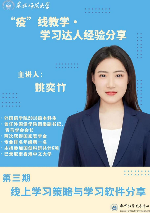 为践行“创造的教育”理念,充分发挥学生的主体作用,了解学生线上学习方式、学习体验与学习期待,帮助学生更好地适应线上学习方式,同时为教师创新线上教学模式提供依据,提升线上教学质量,实现“以学生为中心”的线上教学,近日,教师教育研究院教师教学发展中心推出“疫”线教学·学习达人经验分享系列活动。现推出第三讲——线上学习策略与学习软件分享。本期活动主讲人为外国语学院2018级本科生姚奕竹。一、内容概要学习...