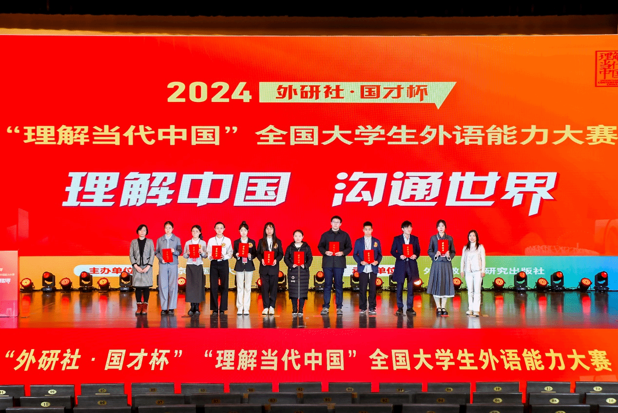 近日,2024“外研社·国才杯”“理解当代中国”全国大学生外语能力大赛总决赛在北京圆满落幕。经过激烈角逐,我校斩获金奖1项、银奖3项,铜奖1项,取得了历史性突破。 外国语学院2021级英语专业本科生李禹都(指导教师:陈彦旭)荣获英语组国际传播综合能力赛项国赛金奖;2021级日语专业本科生马昊晢(指导教师:张卓识)荣获多语种组(日语)国赛银奖;2023级俄语语言文学硕士研究生刘文静(指导教师:朱英丽、齐望...