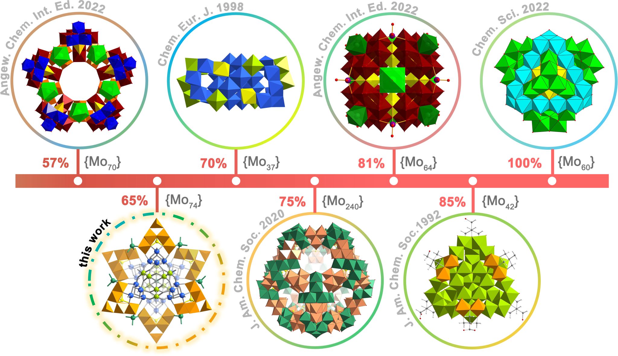 高度还原态多酸被预测为高能量密度材料,然而,它仍然受限于簇种类与还原程度。团队以建筑块策略为有效手段,成功设计合成一例高度还原态高核钼氧簇(C2H8N)14(NH4)4H14[MoV48MoVI26O202(OH)12(SO4)6]∙46H2O (即{Mo74})。通过四配位阴离子模板{MoO4}或者{SO4}指导形成的基本钼氧簇基建筑块{Mox} (x = 4-6)不仅为形成具有前所未有的65%还原度的{Mo74}多酸奠定了基础,而且在孤立的{Mo74}团簇之间产生了次级建筑单元介导的有利于质子传输的超分子密堆积相互作用。由此,化合物在50℃和90%相对湿度下表现出高质子电导率,质子传导活化能为0.32 eV,遵循跳跃机理。本章工作为通过建筑块策略制备高度还原态多酸簇合物提供了依据。该成果以“A highly reduced Mo74 polyoxometalate featuring high proton conductivity accessed by building block strategy”为题,发表于国产旗舰期刊《中国科学:化学》Sci China Chem, 2024, 10.1007/s11426-023-1776-0。