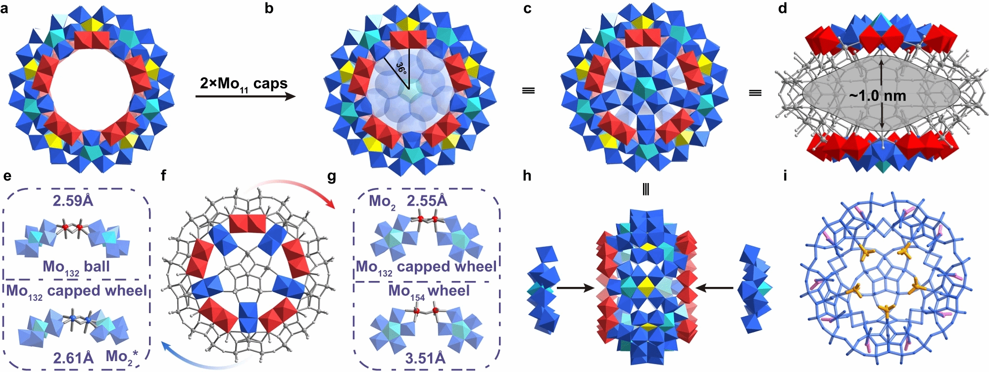 多酸的精准合成对于理解结构和功能之间的构效关系起到至关重要的作用,然而,在不改变多酸主体框架的前提下,完成特定位点的原子级剪裁是一项巨大挑战。基于此,团队探索了对于新型高核钼氧团簇{Mo132}帽轮的铈介导分子裁剪。该{Mo132}包含了前所未有的{Mo110}轮和2个{Mo11}帽,与经典球型{Mo132}互为准同分异构体,但表现出不同的光学行为。铈离子通过‘Inner-On-Outer’配位方式取代前驱体{Mo132}帽轮中反应位点{MoV2}单元,进而驱动裁剪位点{MoV2*}单元的解离,最终产生可预测的半封闭型剪裁产物{Ce11Mo96}。{Ce11Mo96}表现出高质子传导效果,比前驱体{Mo132}帽轮高出近两个数量级。这项工作有效推进了功能性多金属氧簇的可控组装。该成果以“Ce-mediated molecular tailoring on gigantic polyoxometalate {Mo132} into half-closed {Ce11Mo96} for high proton conduction”为题,发表于国际知名学术期刊《自然通讯》Nat. Common. 2023, 14, 5025。