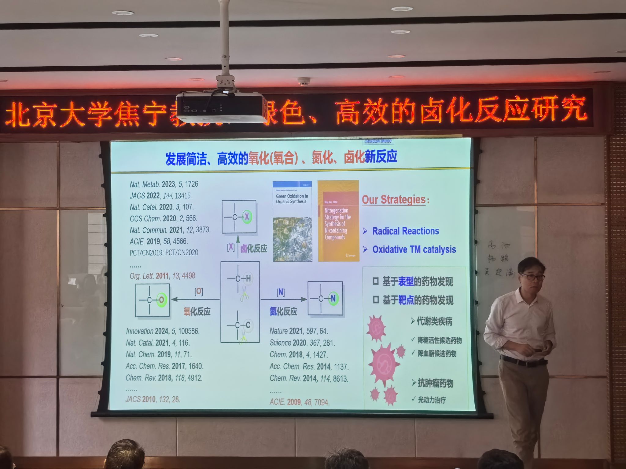 焦宁教授简要介绍了其课题组在发展高效绿色的氧化、氮化及卤化反应的相关工作,以卤化反应为重点,介绍了其课题组系统发展的卤代反应和新型卤代试剂,及该类转化在药物修饰中的重要应用,并讲解了卤代反应相关机制。随后焦宁教授向师生们分享了药物分子修饰改造促成新药发现的案例“糖尿病合并非酒精性脂肪肝病候选药物”,生动展示了药物发现与创新过程中所面临的机遇与挑战,为我们带来了一场精彩的学术盛宴。报告中焦宁教授提出走出自己的舒适圈,探索多学科交叉融合,做有用的科学研究。他的报告内容深入浅出,令在场的师生们受益匪浅。