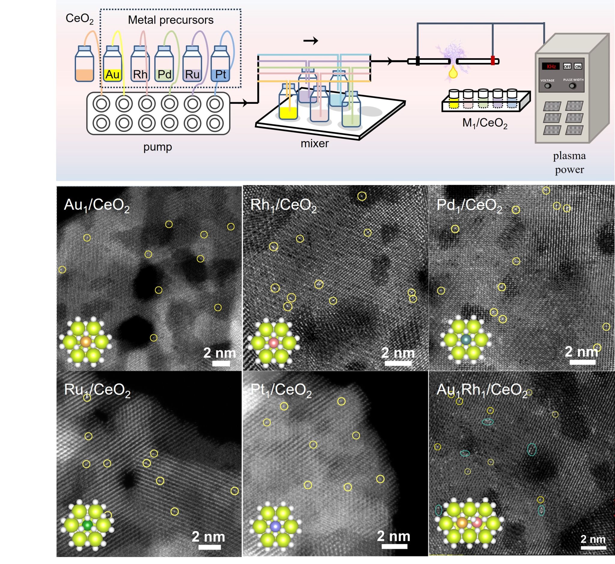 单原子催化剂因其高原子利用率、特殊电子结构和强金属-载体相互作用,已成为催化领域的研究热点。然而,传统的单原子制备方法通常采用载体预先缺陷化、再锚定金属单原子的策略,这导致金属还原度低、载体锚定弱,从而限制了催化剂的活性和稳定性。为此,该团队在前期液相等离子体间歇制备单原子Au/CeO2催化剂的基础上Adv. Funct. Mater.(2022, 32, 2207694),进一步发展了连续流制备单原子催化剂技术,在0.03 s的停留时间即可实现97%以上的金属前驱体捕获效率,成功制得了CeO2基单原子Au、Rh、Pd、Ru和Pt催化剂以及Au1Rh1/CeO2和Au1Pd1/CeO2双原子催化剂。该连续流溶液等离子体方法利用清洁电力,能够连续生产单原子催化剂,具备原子经济性和无需添加还原剂等优点,为单原子催化剂的程序化和绿色合成提供了有效途径。该成果以“Continuous-Flow Solution Plasma for the Atom-Economic Synthesis of Single/Dual-Atom Catalysts” 为题,发表于国际著名期刊Adv. Funct. Mater.(2024, 34, 2407276);论文的第一作者为物理学院博士毕业生邢艳梅;通讯作者为物理学院张昕彤教授、王长华副教授。