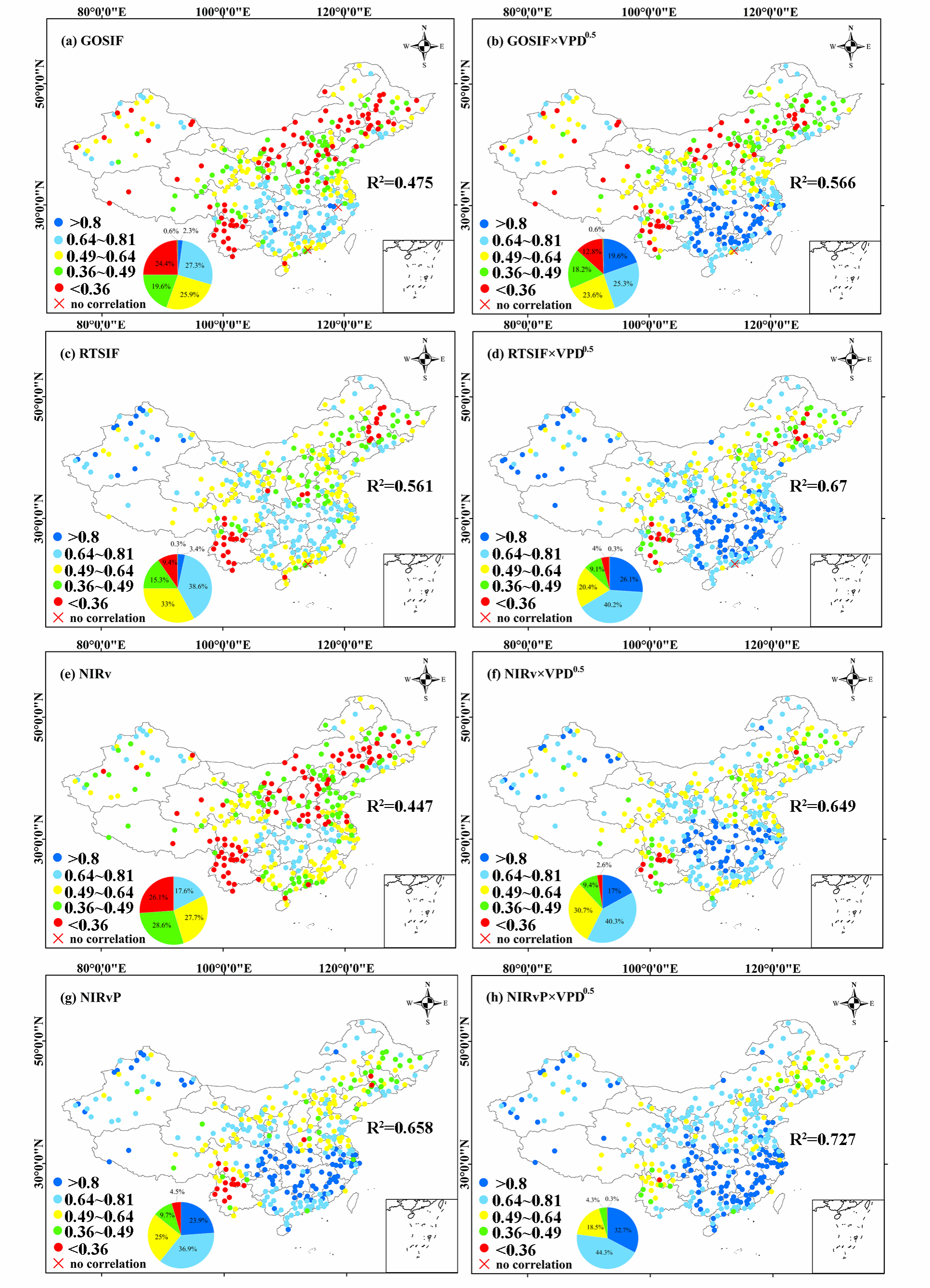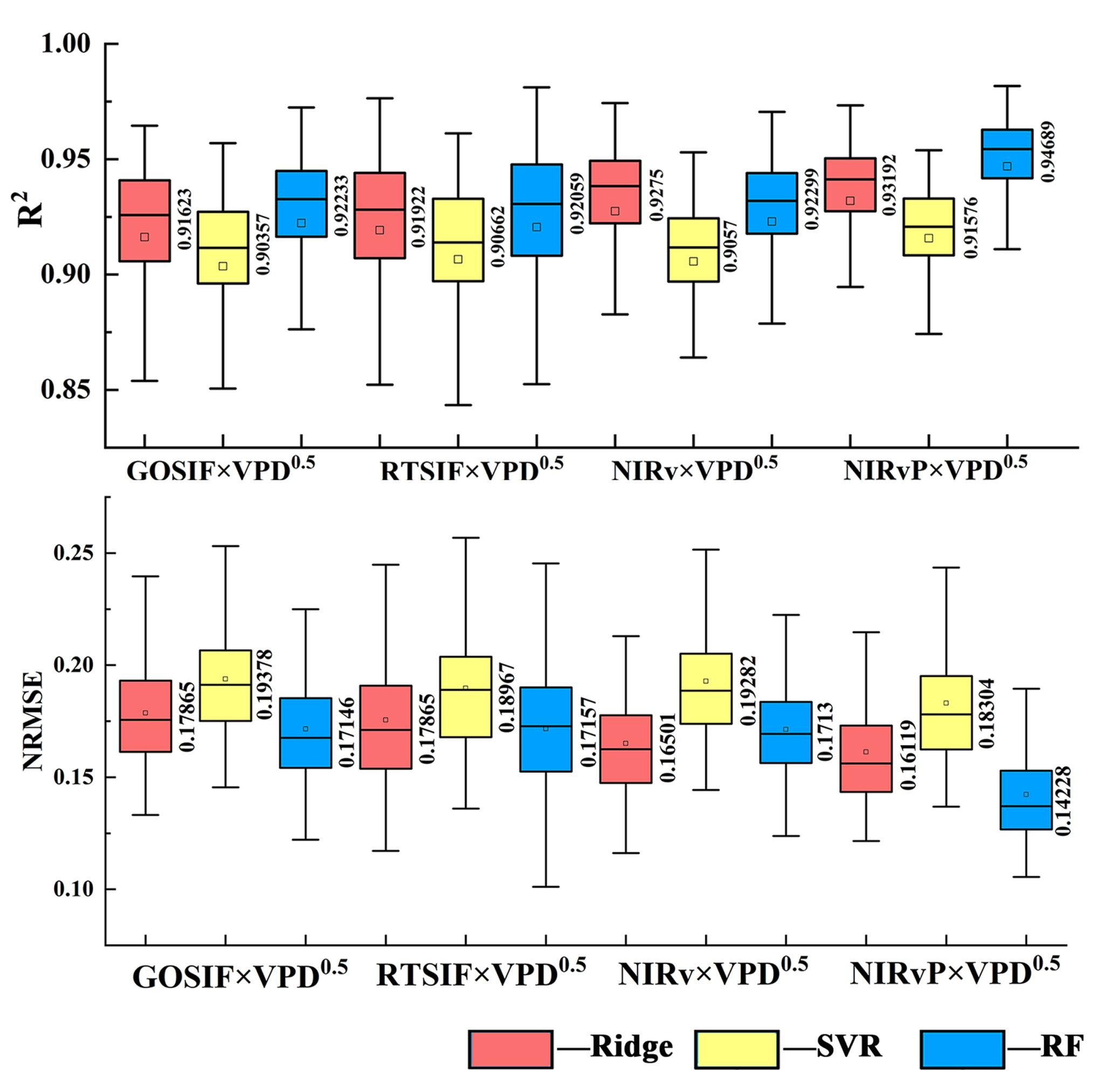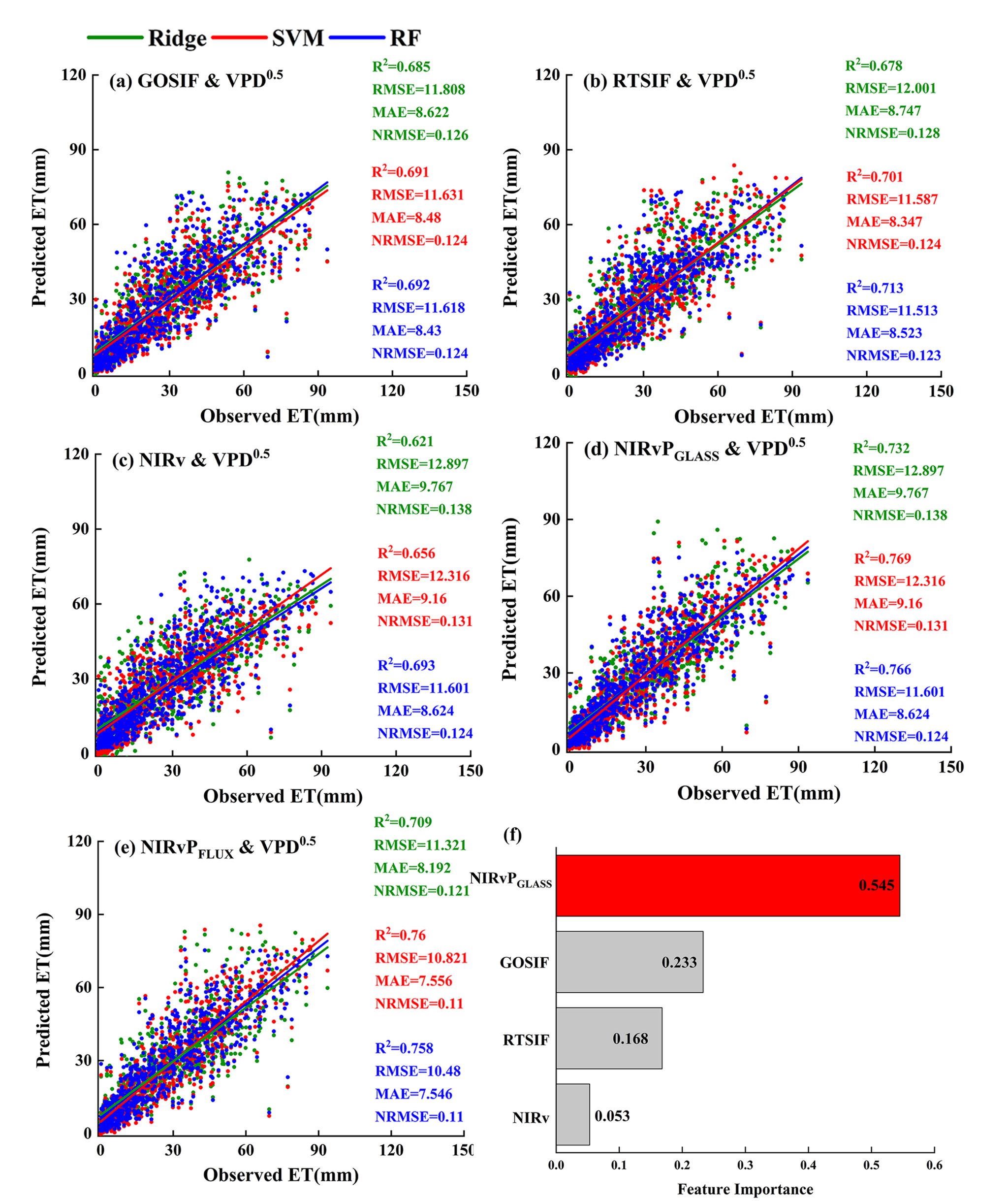 相比各种SIF和NIRv,NIRvP与ETo-PM和ET的线性关系更强。同时,经过VPD0.5的缩放,NIRvP与ETo-PM的线性关系得到增强。非线性关系上,基于性能最佳的RF的结果表明,NIRvP×VPD0.5拟合的ETo仍然具有最高的R2;NIRvP和VPD0.5拟合ET也具有最高的R2。