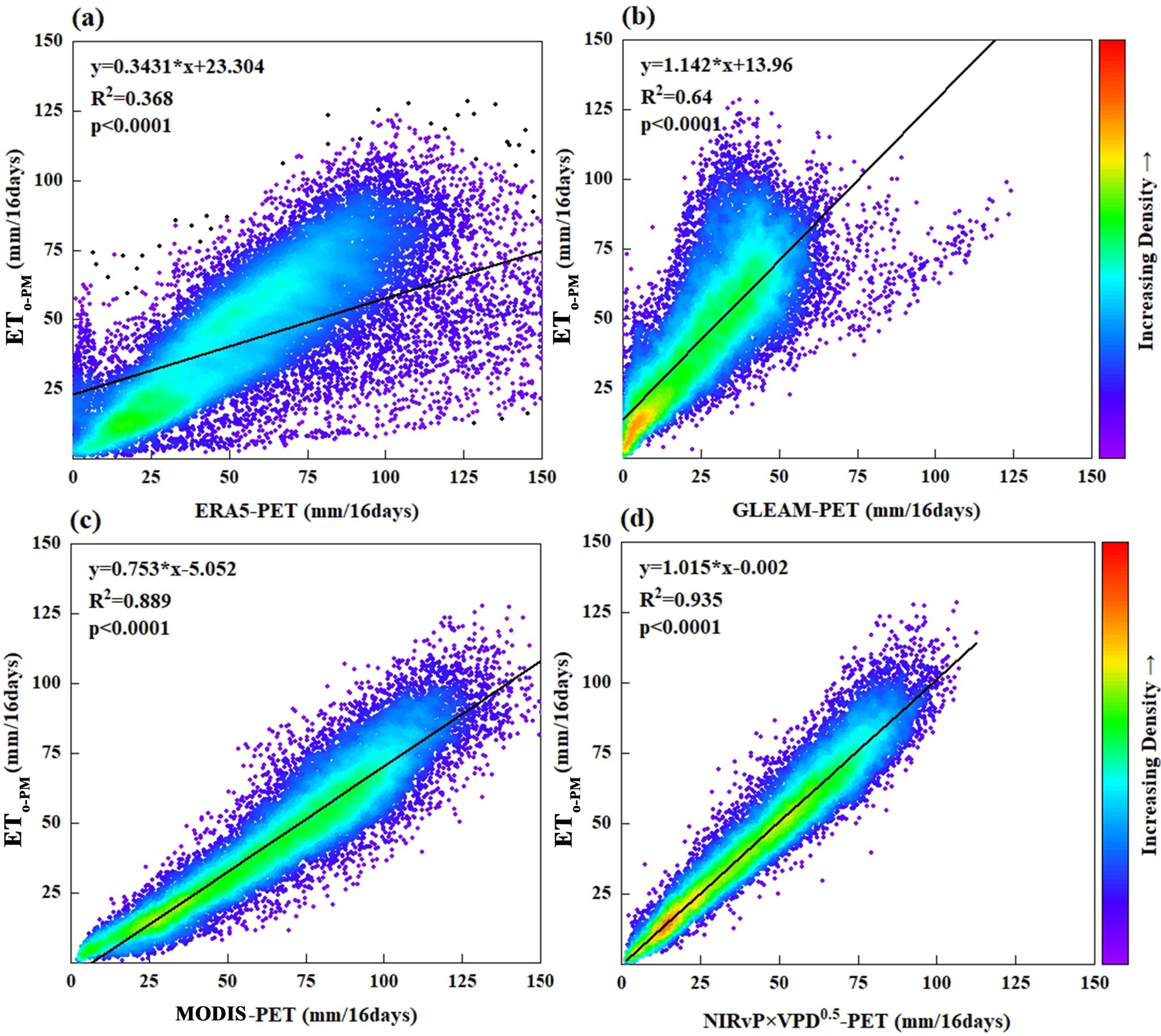 最近开发的近红外反射指数(NIRv)已被证明与植被光合作用密切相关,并且还具有估算总初级生产力(GPP)的潜力。NIRv和光合有效辐射(PAR)的乘积NIRvP已被证明是植被光合作用的更稳健指标,并且通过比较,NIRvP和GPP之间的关系可能优于日光诱导叶绿素荧光(SIF)。此外,植被光合作用、代谢过程、气孔导度和蒸腾作用在一定程度上是耦合的。因此,这些新开发的指数在估算ET或ETo方面也具有很大的潜力。因此,比较和识别更有利的遥感指标对于准确的ET或ETo估算具有重要意义。