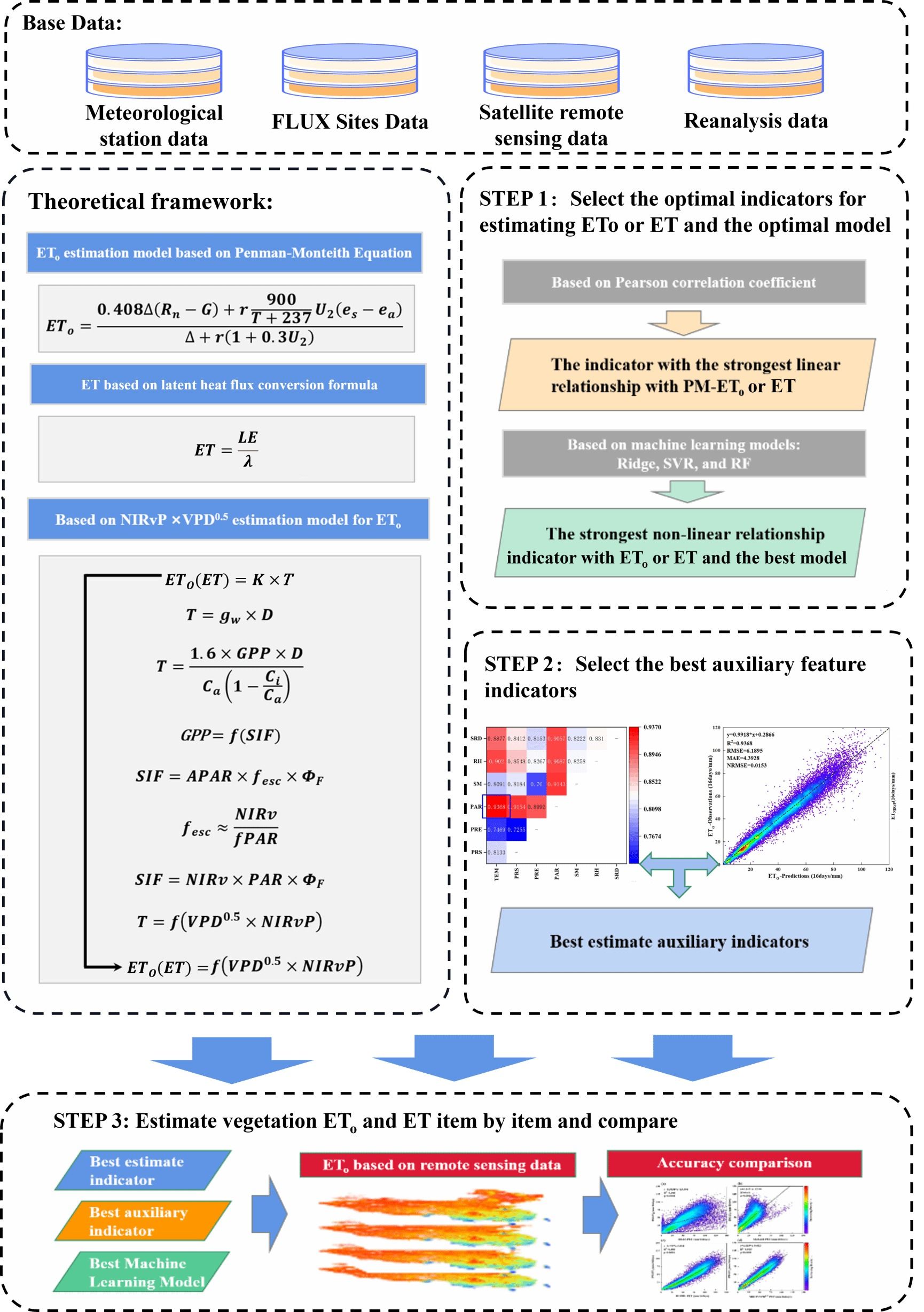 蒸散(ET)是指通过土壤蒸发和植物蒸腾作用损失到大气中的水总量。蒸散是水循环的关键组成部分,在水、能量和碳水化合物的循环中起着重要作用。相应地,作物参考蒸散量(ETo)与ET作为植物需水量的重要指标,对农业生产和水资源管理至关重要。ETo或者ET的准确估算可以帮助农业合理安排水资源,从而提高农田水资源利用效率,适应区域和季节性需求变化。同时,可靠的ETo或ET数据对于准确模拟全球水循环和气候模型至关重要。由于地面观测站数量和分布的限制,准确估算区域尺度或全球ETo和ET一直是一个挑战。