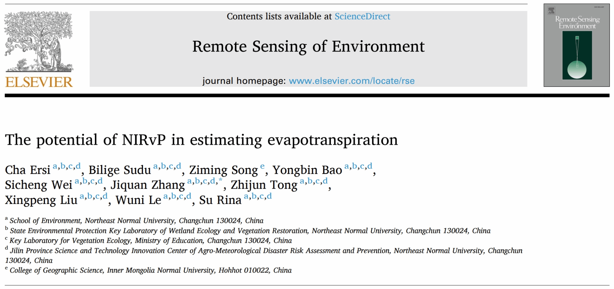 Ersi, C., Sudu, B., Song, Z., Bao, Y., Wei, S., Zhang, J. et al. (2024). The potential of NIRvP in estimating evapotranspiration. Remote Sensing of Environment, 315, 114405.