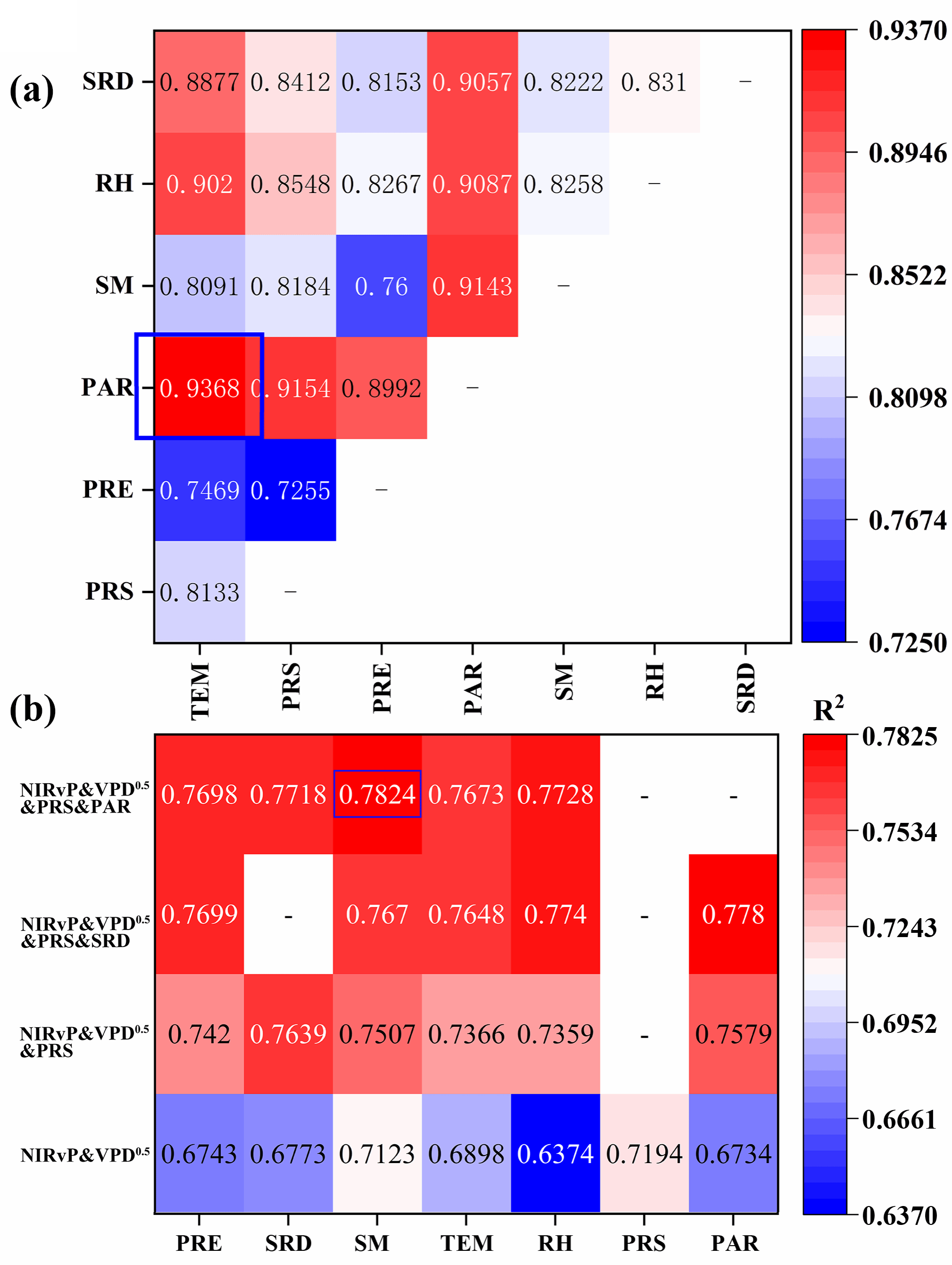 由于影响蒸散的因素多种多样,仅使用植被遥感数据估算蒸散可能还不够。这里介绍一些除植被遥感指标外的辅助指标,以进一步估算蒸散量。我们共选择了7个辅助指标(包括降水PRE、气压PRS、温度TEM、短波辐射SRD、光合有效辐射PAR、相对湿度RH和土壤湿度SM)作为特征变量来辅助估算ETo和ET。通过对比不同辅助指标组合的估算精度,我们确定了最佳的辅助指标:TEM和PAR,实现了拟合精度R2高达0.9368。此外,通过累积组合,我们也确定了估算ET的最佳特征指标:PRS、PAR和SM,实现了拟合精度R2高达0.7824。