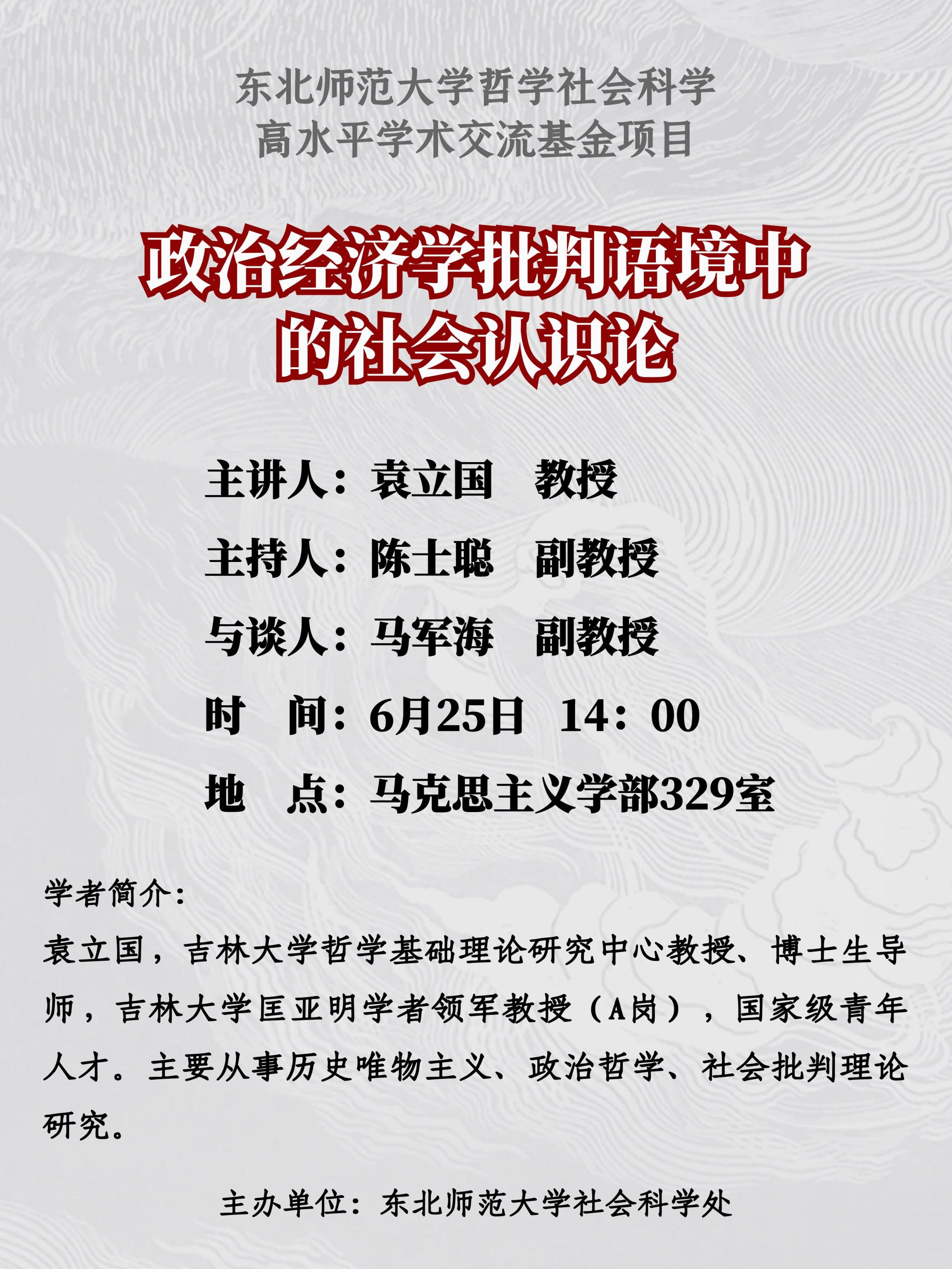 主讲人简介:袁立国,吉林大学哲学基础理论研究中心教授、博士生导师,吉林大学匡亚明学者领军教授(A岗),国家级青年人才。主要从事历史唯物主义、政治哲学、社会批判理论研究。