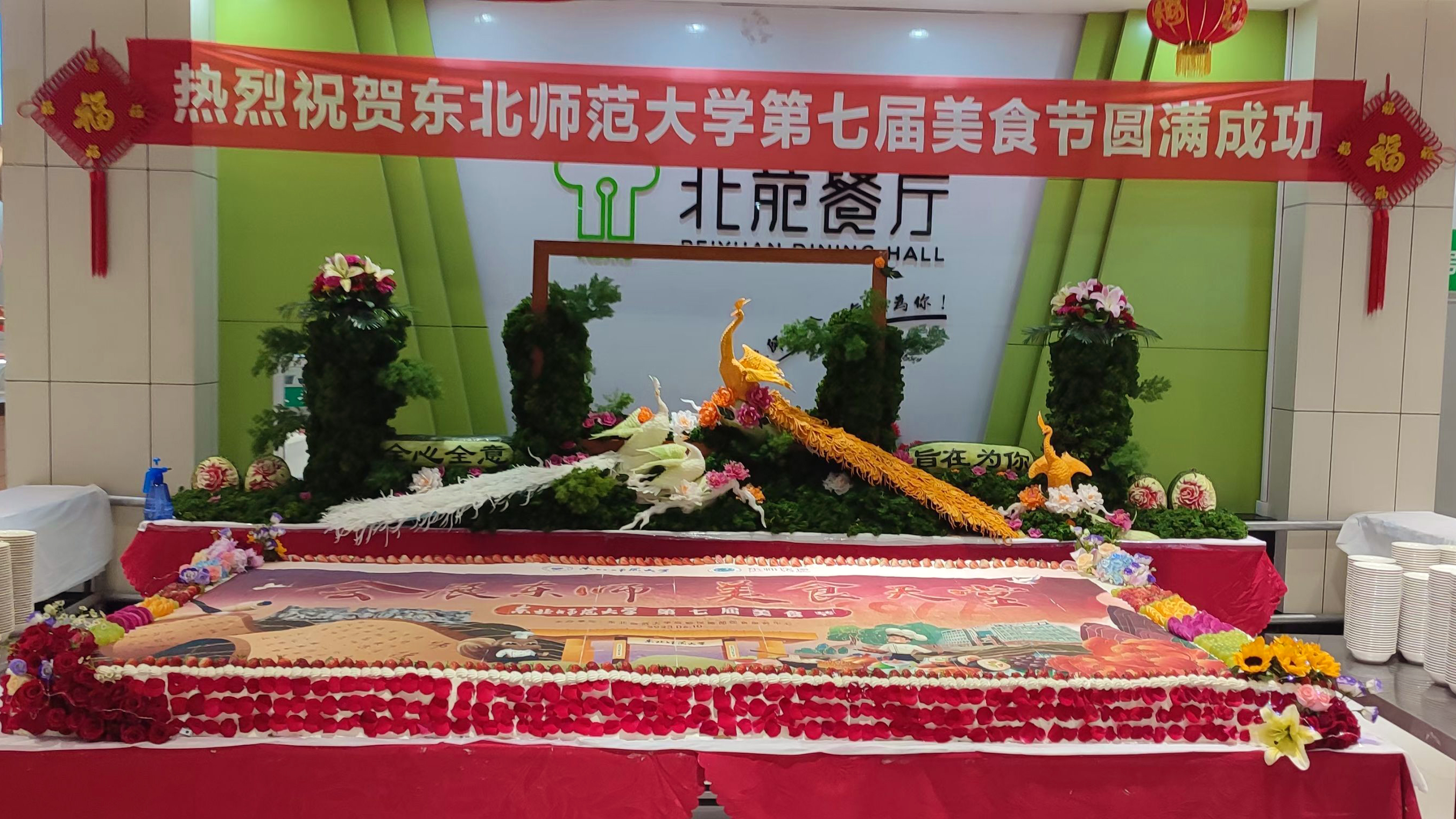 与运动会同时进行的,还有以“会展东师,美食天堂”为主题的第七届东师美食嘉年华活动。食物雕刻构思精巧、栩栩如生;“千里江山”和“高山流水”隔空呼应,相得益彰;各式菜系争奇斗艳、难分伯仲;免费分发的巨型蛋糕和烤全羊,在无数学子们的期待和惊叹中,将美食节的气氛推上了高潮……此次活动由后勤保障部饮食服务中心与校团委联合举行,在两校区餐厅及周边以食会友,邀师生共品东师“食韵”。从精心烹饪的珍馐佳肴到精美可爱的小糕点,菜品中融入了多种中国元素、东师元素,每道菜都有自己独特的主题、故事和味道。活动采取线上与线下相结合的形式进行,川剧变脸、舞狮表演、音乐演唱等精彩节目,为美食节增添了火热气氛。当天,学校餐厅推出全部档口7折特价活动,以回馈广大师生的支持。