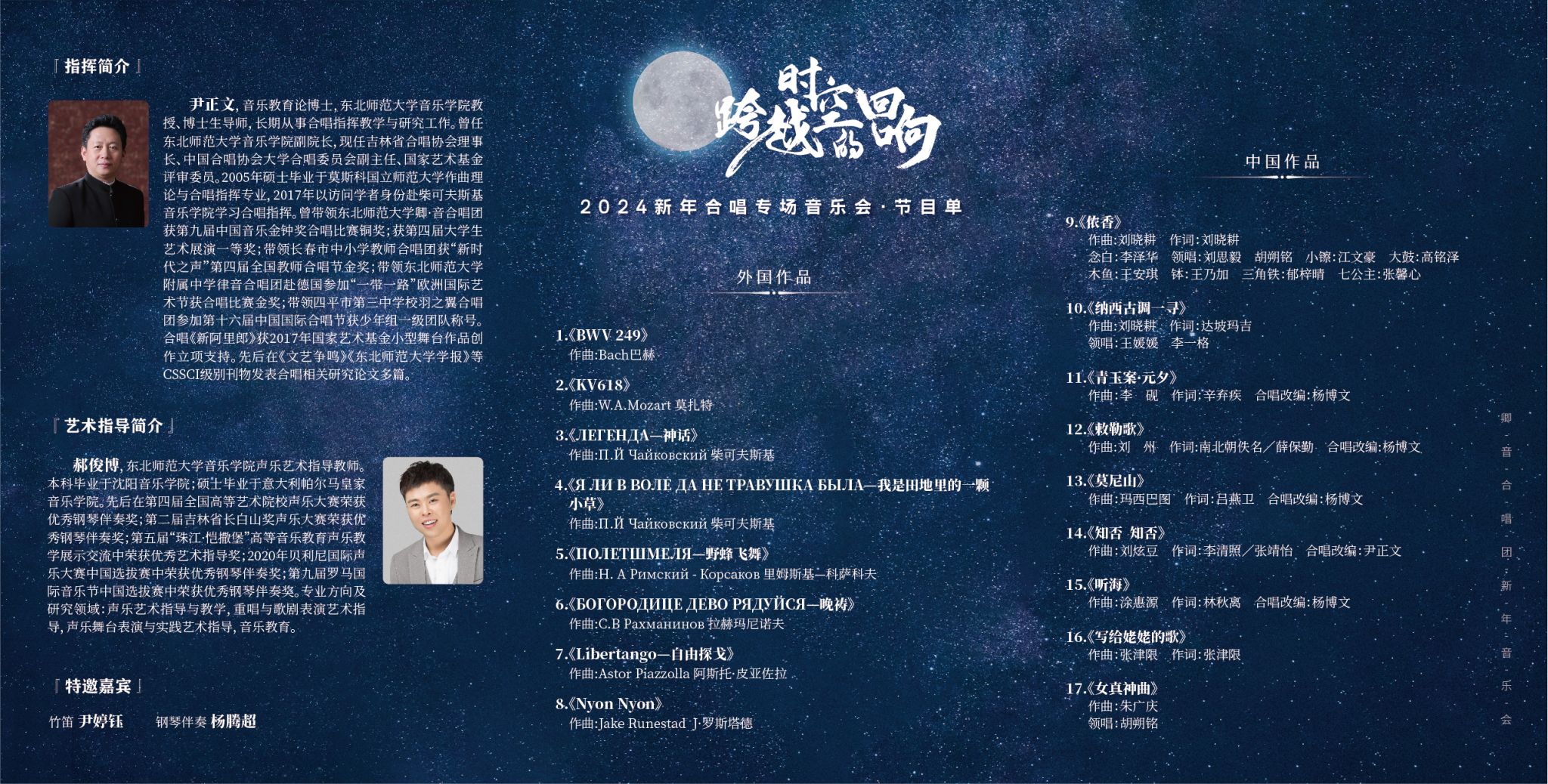 为搭建实践平台、延伸课堂教学、服务社会文化、培养优秀人才,由我校音乐学院主办的2024年新年合唱专场音乐会“跨越时空的回响”首场演出将于12月21日15:00在我校本部音乐厅举行。新年音乐会秉承“高品质、文化性、知识性、普及性”的特色,多年来已经成为吉林省内亲民、惠民的文化品牌,欢迎广大师生届时亲临现场聆听新春之声、东师之声,感受高雅艺术的魅力。