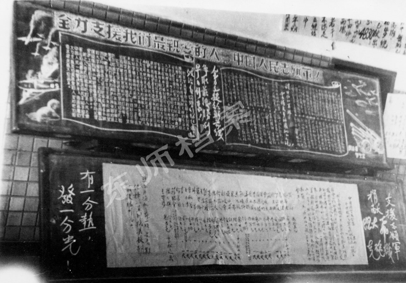 东北是抗美援朝后方补给和战勤保障的重要基地。在我校党委和保卫世界和平反对美国侵略支会的组织领导下,抗美援朝期间,我校师生不仅踊跃参军参战,而且全力打造后方生命补给线,为夺取抗美援朝战争的胜利贡献了东师力量。