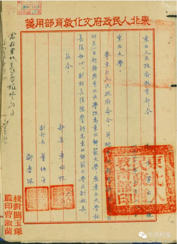 1948年10月22日,东北行政委员会在《关于教育工作的指示》中指出:中学师资由东北大学负责培养,并确定东北大学由东北行政委员会通过教育部直接领导,省里给予协助。