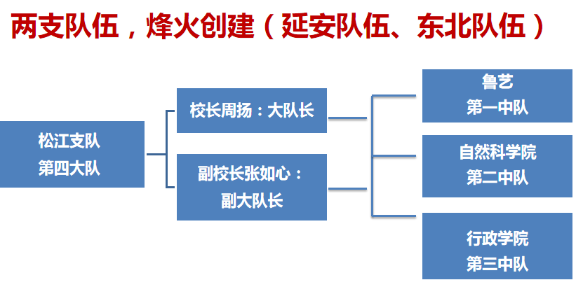 1945年11月中旬,迁移东北、华北等解放区的延安文教单位组成一个支队,延安大学是其中的一个大队,行军编号是“松江支队第四大队”, 周扬任队长,张如心任副队长,刘呈云任副队长兼政治部主任。下属三个中队,鲁艺是第一中队,中队长宋侃夫;自然科学院是第二中队,中队长王甲刚;行政学院是第三中队,中队长于光远。这支六七百人的迁校队伍就这样告别延安,分别向东北挺进。
