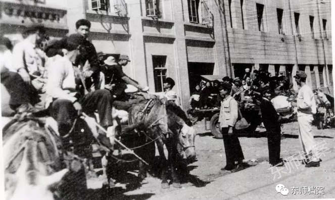 1946年东北大学新生在哈尔滨东大办事处前集合赴佳木斯