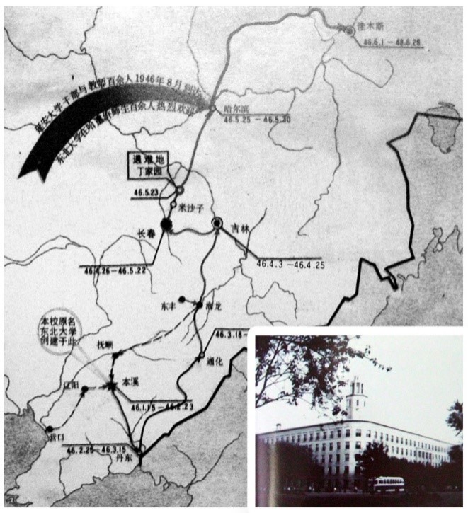 因国民党军队的围追堵截,1946年5月24日,全校师生逃至哈尔滨市,部分学生留哈接收哈尔滨医科大学,其余分批继续挺进佳木斯。1946年5月29日至6月1日,东北大学师生陆续到达“东北的延安”——佳木斯市。