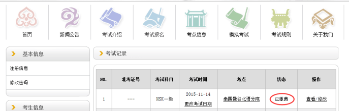 5)考试费支付成功以后,不可以取消考试;考试前10天(含第10天),考生可以选择更改考试日期(缓考),改为报名本考点当年举办的任何一次相同级别的考试,并缴纳考试费的30%作为更改手续费。
