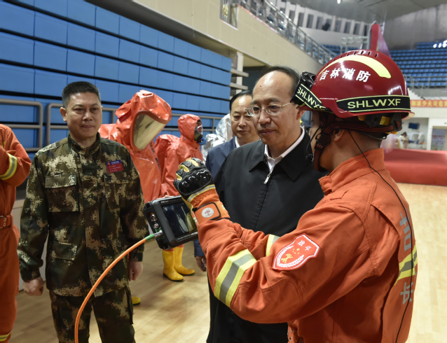 仪式结束后,全体与会人员还观看了吉林省消防建设图片展和消防器材装备展。参会领导和省安全生产成员单位、在长高校保卫部门负责人来到我校应急指挥中心,观摩了校园消防安全智慧管理工作。