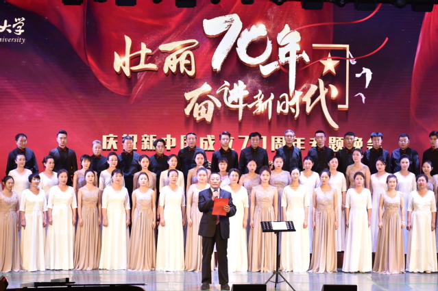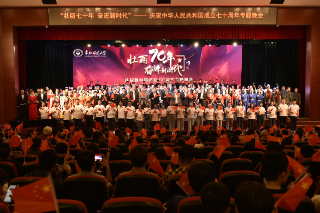 晚会伊始,王延代表学校发表致辞。他说,勤劳勇敢的中国人民创造了亘古未有的人间奇迹,谱写了中华民族自强不息、团结奋进的壮丽诗篇。新中国的七十年也是东师在探索中发展、在改革中奋进的七十年。七十余年来,我们弘扬“强师报国,求实创造”的东师精神,践行“勤奋创新、为人师表”的校训精神,高举为基础教育服务的大旗,扎根中国大地,办人民满意的教育,为祖国各条战线输送了无数杰出的人才。刚刚结束的学校第十五次党代会为全体东师人提出了“深化内涵发展,固本提质拓新”的明确目标,绘就了美好蓝图。站在新的起点,每个东师人都应积极投身伟大时代,将祖国装在心中,把责任扛到肩上,在国家繁荣发展的时代洪流中,用奋进之笔描绘世界一流师范大学的美好明天,书写中华民族伟大复兴中国梦的壮丽篇章。他说,本场晚会旨在以文艺的形式来讴歌伟大的祖国,激励我们铭记红色历史,继承优良传统,弘扬革命精神,踏着先辈的足迹,为实现中华民族伟大复兴接力奋斗。