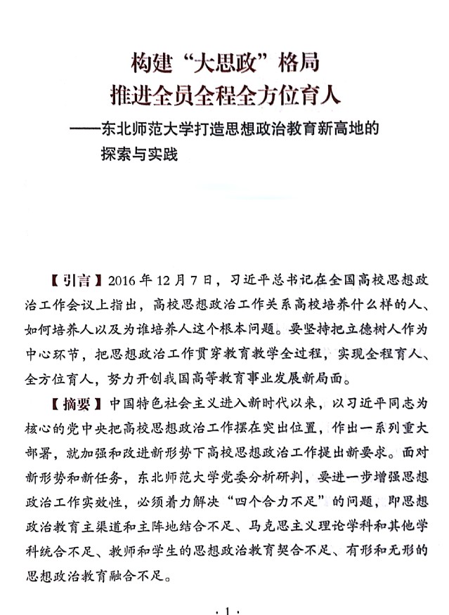 我校是中国共产党在东北地区创建的第一所综合性大学,历来十分重视思想政治工作。党的十八大以来,面对新形势和新任务,我校党委将增强思想政治工作实效性摆在首位,着力解决思想政治教育主渠道和主阵地结合不足、马克思主义理论学科和其他学科统合不足、教师和学生思想政治教育契合不足、有形和无形的思想政治教育融合不足等问题,在抓好顶层设计、抓好队伍建设、抓好要素协同等方面,探索创新了“一体化领导、专业化运行、协同化育人”的思想政治工作体制机制,构建了以课程思政、日常思政为主体,文化思政、网络思政为浸润,学科思政为支撑的“大思政”格局,提升了思想政治教育科学化、专业化水平。经过多年实践,塑造了广大师生“信念坚实、学识扎实、为人朴实、作风踏实”的优良品格,在全员全程全方位育人要求得到有效落实的同时,彰显了我校思政工作品牌。