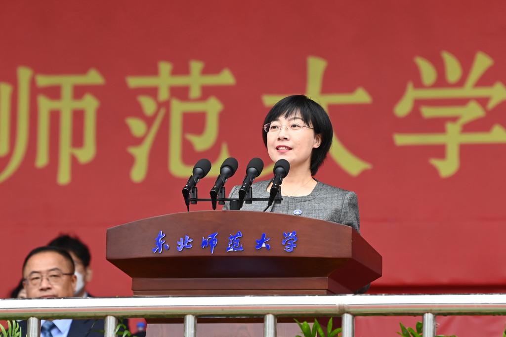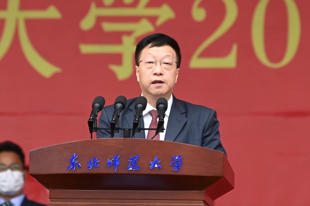 庄严肃穆的升旗仪式后,刘益春首先致辞。他代表学校对2022级新生的到来表示衷心的祝贺和热烈的欢迎。他谈到,东北师大是一所教育图强、育人兴邦的神圣学府。76年来,一代代东师人秉持“勤奋创新、为人师表”的校训,孜孜求索、奋进担当,为国家富强、民族复兴作出了重要贡献。刘益春说,强师报国,是全体东师人的精神底色。作为中国共产党在东北创办的第一所综合性大学,学校始终坚持“以党和国家的需要作为办学选择”。无论时代如何变迁,东师人才培养的使命没有变,强师报国的责任担当没有变。同学们要心怀国之大者,笃行奋进,光大东师人的报国精神。他指出,求实创造,是新时代东师人的共同追求。如今的东北师大朝气蓬勃、快速发展。今年在国家新一轮“双一流”建设中,学校马克思主义理论、教育学、世界史、化学、统计学、材料科学与工程6个学科入选“一流建设学科”。面向未来,学校将在“尊重的教育、创造的教育”理念引领下,向着建设世界一流师范大学的目标不断迈进。