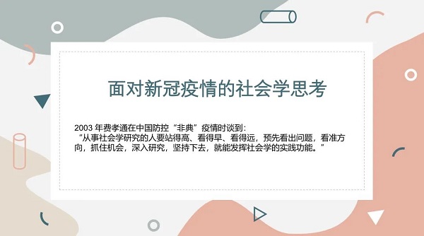 这次线上课程上,我们学习的专题是面对疫情的社会学思考。老师从我们当下的静态管理出发引入话题,通过分析研讨社会学专业文献的疫情相关研究,让我们理解社会学知识在社会现象中的运用。老师也为我们邀请到了两位专家,在线上给我们分享了他们在疫情爆发之后为疫情防控所做出的奉献和自己的感受,我们听过之后都感触颇深。在这节课上,我既学到了很多社会学的知识,同时也明白了任何通过社会学的角度来观察生活,有了不小的收获。