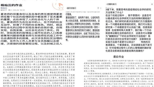 当疫情来袭,老师着眼于严峻的抗疫形势,引导同学们展开面对疫情的社会学思考。同学们在课堂上分享疫情发生以及学校静态管理后个人的体验与思考,同时老师邀请一线社区工作者夏姐姐和徐哥哥现身说法,让同学们直击抗疫一线,明白在疫情肆虐的当下社会治理的现状。课后,老师呼吁同学们协同合作,自主选择访谈目标,进行研讨思考。在这门课程上,虽然师生只能在线上交流,但是同学们收获了许多社会学知识,同时真正立足社会学视角,拥有了对疫情防控的独特体验与思考,从“旁观者”转变为“参与者”。