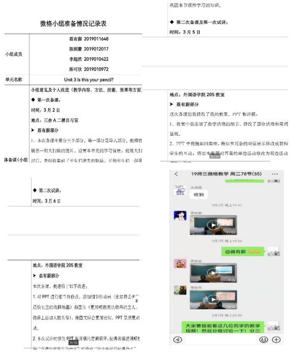 《微格教学》是师范院校为师范生开设的教师教育类课程。《微格教学》为师范生创建了一个练习环境,使日常复杂的课堂教学得以精简,并通过教师和同伴给予的大量针对性反馈意见,让师范生感知新课程理念如何在教材中体现,教材内容如何转化为教学内容,了解课堂教学的基本流程,培养师范生基本教学技能。这门课程是《课程标准与教材分析》课程的具体实践,也是大四实习前的准备课程。以往《英语微格教学》都是由大学教师单独授课。大学教师和师范生对中学生的认知水平理解不够或没有深入了解,是导致语言教学理论和中学英语实践不能很好融合的一个重要原因。本学期《英语微格教学》吸引优秀的中学英语教师与大学教师组成授课团队,实施协作教学,学生组成线下教学实践共同体,突显团队协作、同伴互动等价值观在疫情防控期间的重要意义,是本学期《英语微格教学》的主要特色。