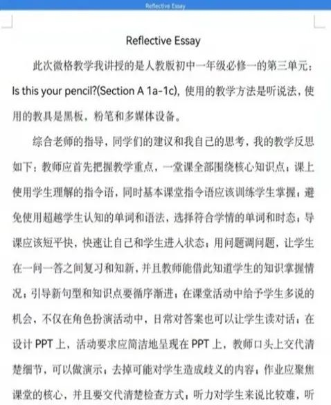 线上形式的微格课程对老师和我们学生都提出了一定的挑战。虽然录课的形式使得课堂的真实性无法很好展现,但小组同学通力合作,互相模拟师生,最大程度地模拟出了真实课堂的效果。其他小组同学的录课展示也让我收获颇多。老师和中学一线教师的专业点评和同学互评,让我们逐渐了解了一堂好课的样子和自身的不足。可以说,微格教学这门课程对于我们师范生真正成为一名合格教师助益良多。