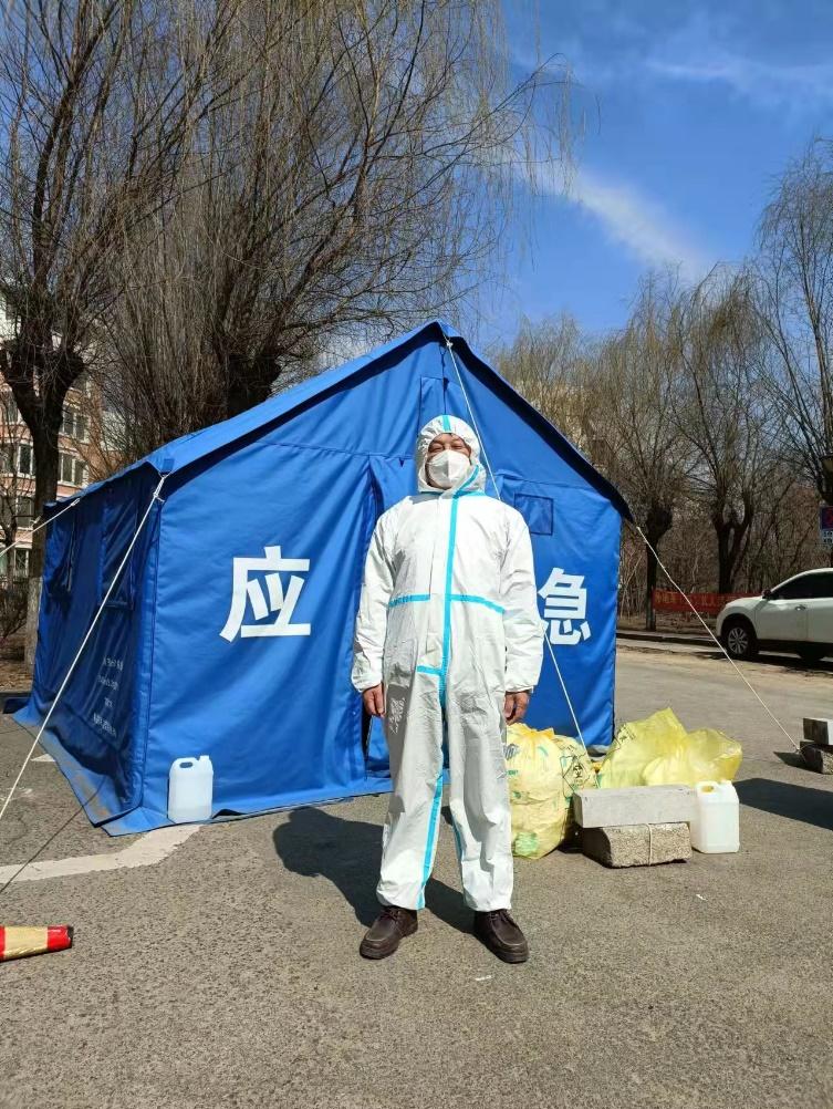 田爽,作为一名退役军人,一名共产党员,一名高校员工,对于疫情,他总是选择迎面而上,正面狙击。从2021年开始,他就积极加入了抗疫志愿者的队伍,并成为朝阳区优秀抗疫志愿者。2022年的春天,他也是同样的选择。从长春进入静态管理开始,他就向学校、向社区提出了志愿服务的申请。3月18日,他收到了奥体中心方舱管理人员的来电,询问是否能加入方舱医院的志愿者队伍,他欣然同意,当日就提交了审查资料。3月24日,鉴于以往的志愿者表现,他被批准成为长春市北湖方舱医院的一名志愿者,拉响了他与疫情的正面战斗。