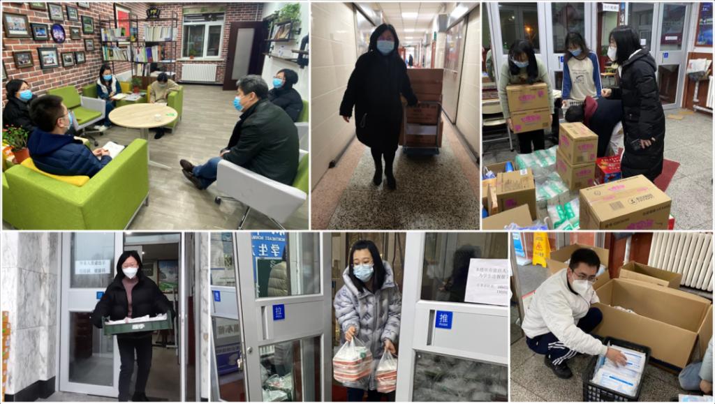 守护学生健康安全,同心战疫暖心房。政法学院学生工作组全体成员驻守战疫一线,每日三餐均按时保量送达,为学生采购配发口罩、手套、消毒液等防疫物资,方便面、牛奶、卫生纸等生活物资,让学生在静态管理期间感受学工组的关心和爱护。专任教师兼职辅导员于雪婷、辅导员刘梦桃参与学生餐食搬运、发放、核酸检测等工作,并对学生进行心理疏导,解决学生的困难。辅导员薛冰主动承担师生用药统计与配送工作,每日配送所需药品,风雨无阻。