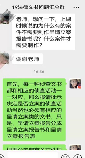 文书接龙活动不需要分组,可在全班进行。法律文书的特点决定了法律文书可以串联起整个诉讼活动,根据侦查活动的程序需要,有“提请”当然就有“回复”。课后通过在班级群里接龙的形式,一位学生完成课后作业文书练习写作后,可以随机指定一名同学对自己的文书进行回复,整个过程不但实现了文书写作练习,加深了学生对相关诉讼法知识的理解,也达到让学生复习或预习课程内容的效果。