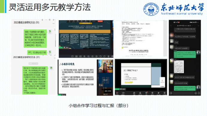 政治学研究方法这门课程老师使用了钉钉会议和钉钉在线课堂等多种方式,可以根据每堂课的实际效果及时转换。在平常讲课多用钉钉直播,看到老师的共享画面简洁明了,课后还有回放方便同学们再次学习和完善笔记。在我们进行小组合作汇报时,多采用在线会议的方式,每个人都可以共享屏幕为大家讲解本小组的研究选题,案例分析等等,每个人都能通过自己手上的媒介传播个人的思考过程,更加方便也为老师的记录提供了依据,非常便捷。