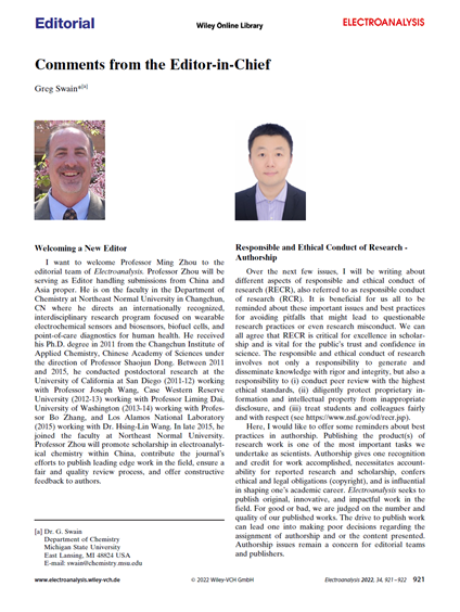 图3 周明教授应邀担任Wiley出版社旗下国际知名学术期刊《电分析(Electroanalysis)》副主编