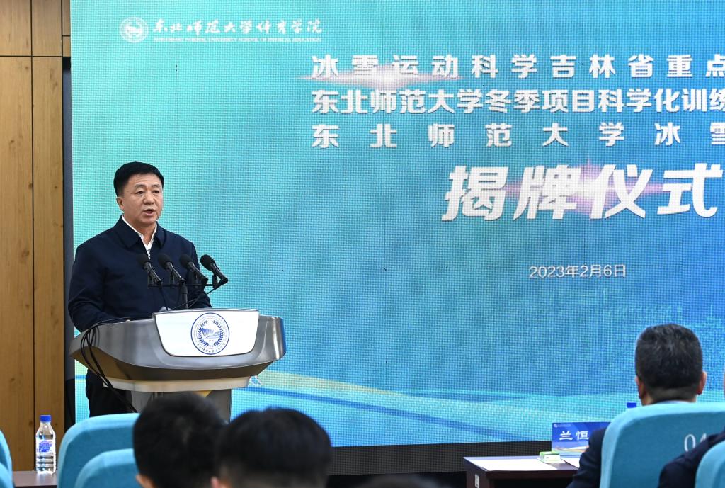 刘学军在讲话中,对东北师大多年来在吉林冰雪运动、冰雪事业做出的突出贡献表示了感谢。他说,东北师大历史悠久、底蕴深厚,在办学的过程中,始终面向体育强国的战略需求,贯彻吉林冰雪项目发展的整体布局,充分发挥学科和科研优势,探索实践体教融合--科技支撑--联合培养的冰雪人才培养模式,为国家和吉林省冰雪事业的发展做出了巨大贡献。冰雪学科作为学校重点发展的特色学科方向,也是省教育厅重点发展和支持的方向,相继培养了张虹、李坚柔、周洋、于静、李奇时等冬奥会冠军、世界冠军和众多冰雪专业人才,持续为中国和吉林省冰雪事业发展助力。刘学军希望东北师大能继续依托学科建设和平台发展优势,整合校内外资源,创新冰雪人才培养模式,建立“产学研用”的一体化人才培养体系,为中国冰雪项目的发展做出更大的贡献。