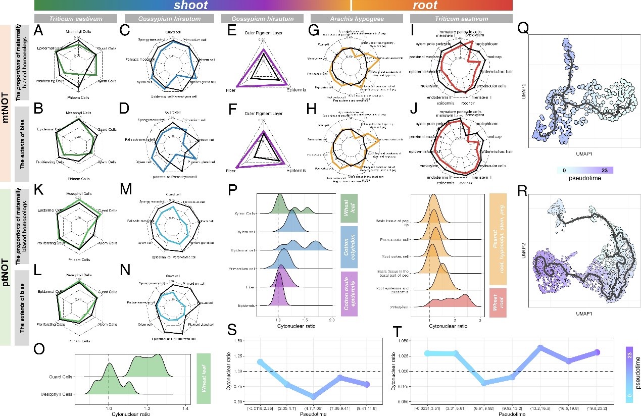 在后续的研究中,团队将研究拓展至单细胞水平,并以全基因组范围内类似RuBisCo小亚基的具有细胞器靶向性核基因为研究对象,利用单细胞转录组测序手段,分析了花生、棉花和小麦三种异源多倍体不同细胞类型的部分同源基因表达偏好,发现母方表达偏好在不同物种、细胞类型和发育阶段都有变化,反映了核质协同进化的多样性及动态性,该研究为单细胞水平进行进化规律及特异性的探索提供了新的方向。相关研究成果以“Cell type–specific cytonuclear coevolution in three allopolyploid plant species”为题,发表于国际著名期刊《Proceedings of the National Academy of Sciences of the United States of America》上(PNAS,2023,Vol.120,No. 40,e2310881120)。生命科学学院张可人博士为该论文的第一作者,宫磊教授、王天雅副教授和南方科技大学龙艳萍教授为该论文的共同通讯作者。