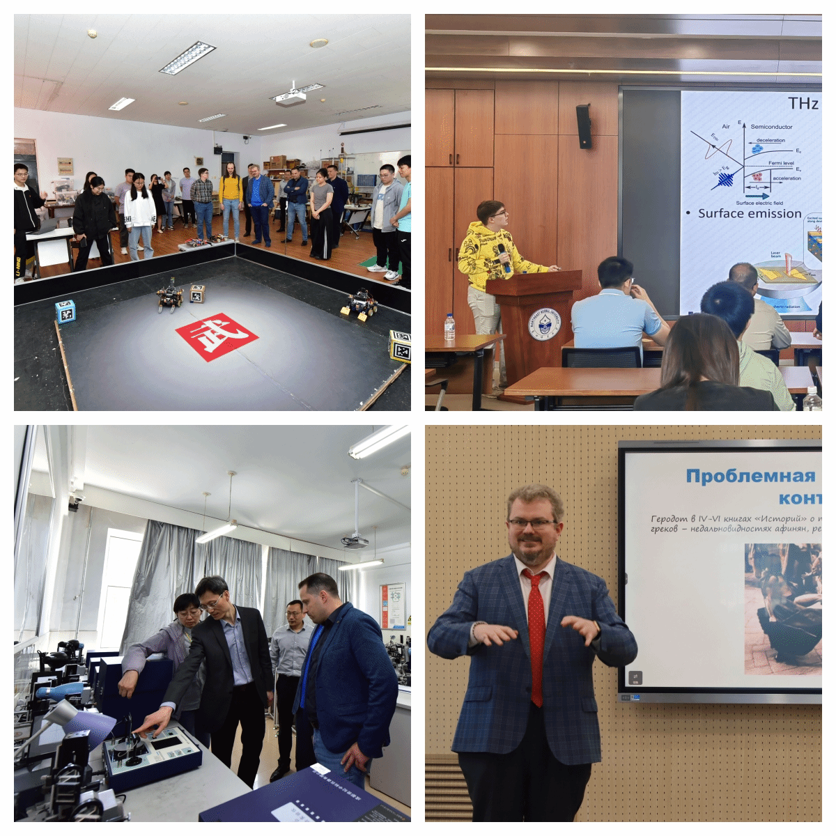 代表团一行参观了我校紫外光发射材料与技术教育部重点实验室、物理学师范专业国家级实验教学示范中心。物理学院院长马剑钢详细介绍了学院的办学历史,学科布局、科研优势及特色。安德烈对学院先进的科研环境、人才培养和科学研究取得的系列成果表示高度赞赏,期待通过教师互派、相关领域合作交流产出更多高水平学术成果。双方在课程体系建设、师范生竞赛培训等领域也达成了合作意向。莫斯科物理技术学院朗道物理研究院副院长列昂尼德·库尔多诺夫(Leonid Koldunov)、高级工程师马克西姆·帕乌科夫(Maksim Paukov)分别做“激光物理学基础”“高适用性材料碳纳米管”等专题讲座,并与我校陆家羲数学物理拔尖学生培养基地师生进行了深入交流。
