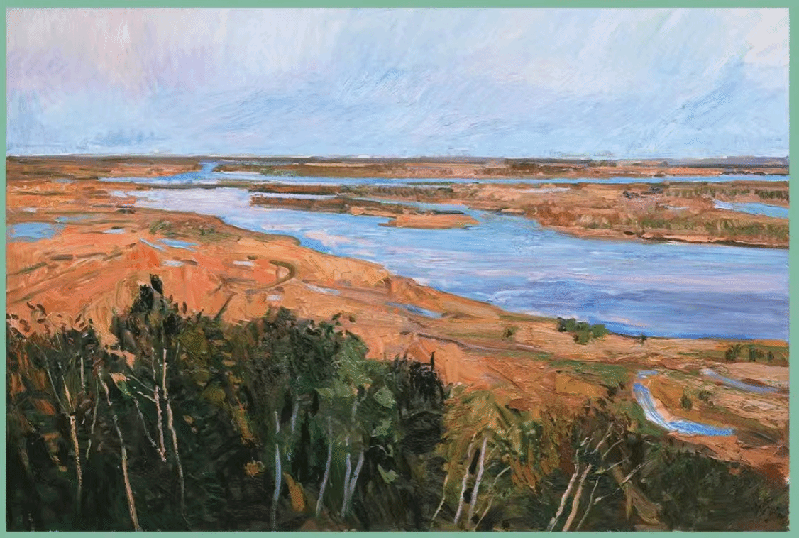 中国美术家协会主席范迪安带领下的油画组采取五地写生接力直播的形式绘就了组画《新千里江山图》。中国美协油画艺委会委员、(全国)教育书画协会美育分会副主席、吉林省美术家协会主席王建国教授开启直播序幕,在“中国东极”黑龙江抚远创作了一件以“青绿”为画意,以祖国第一缕阳光为灵感的作品,用画笔描绘东北土地的丰饶,展现中华大地的壮美与恢宏。