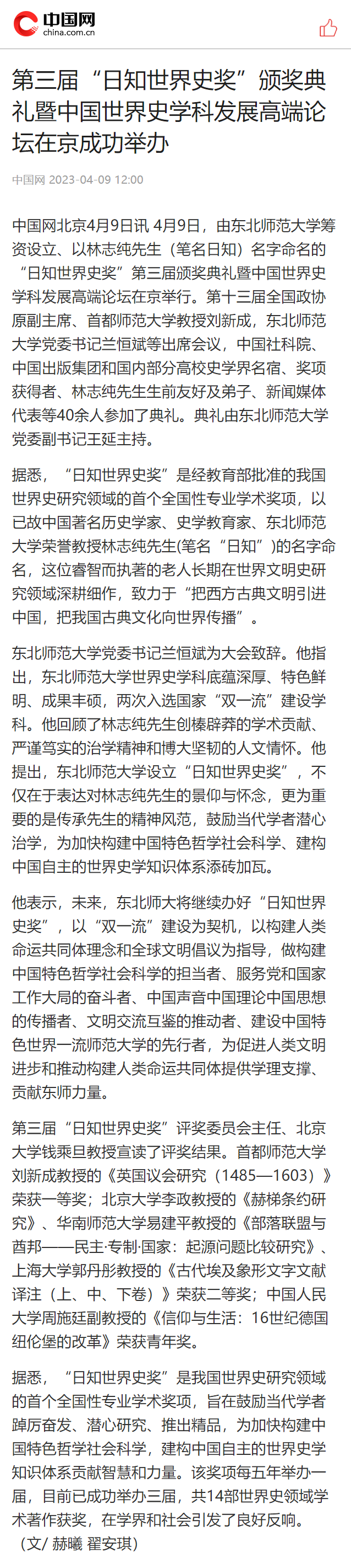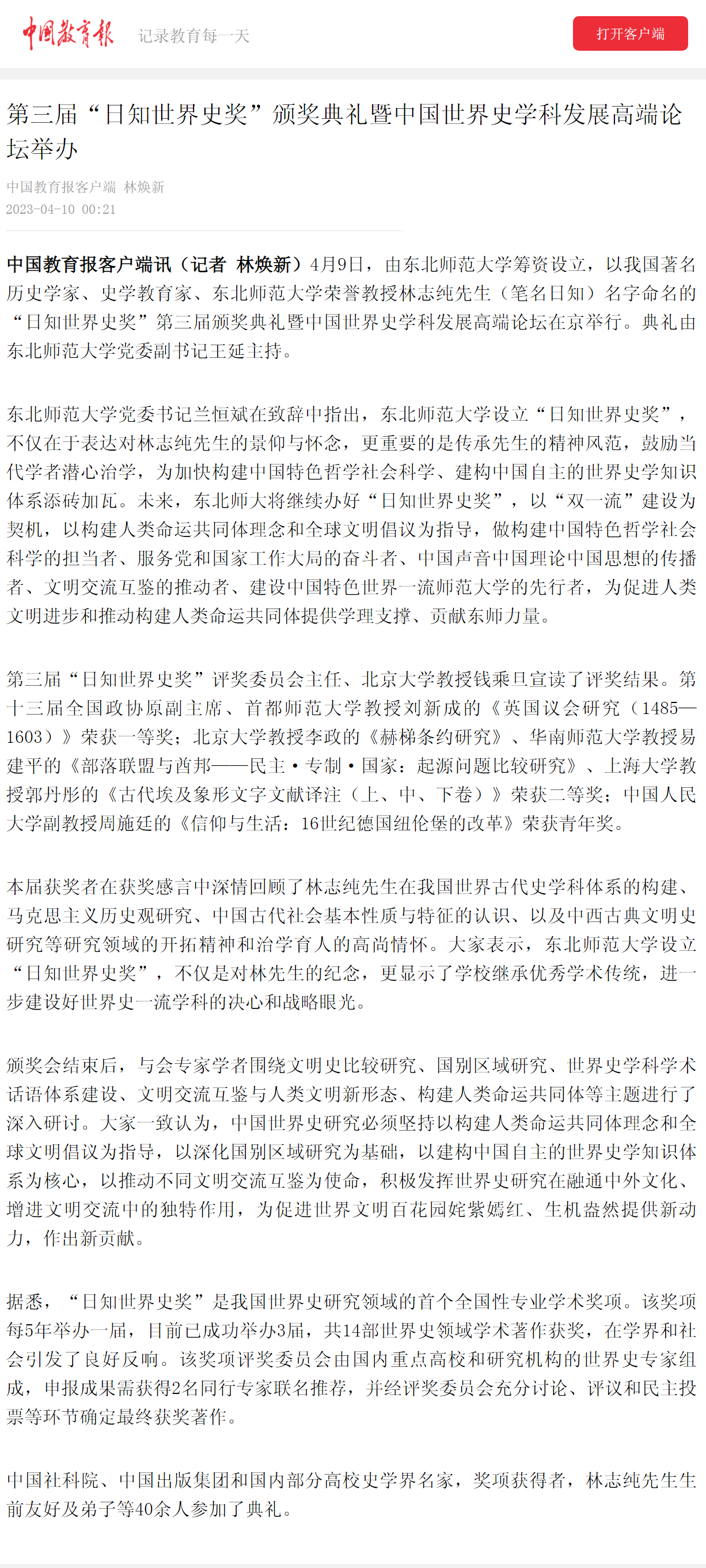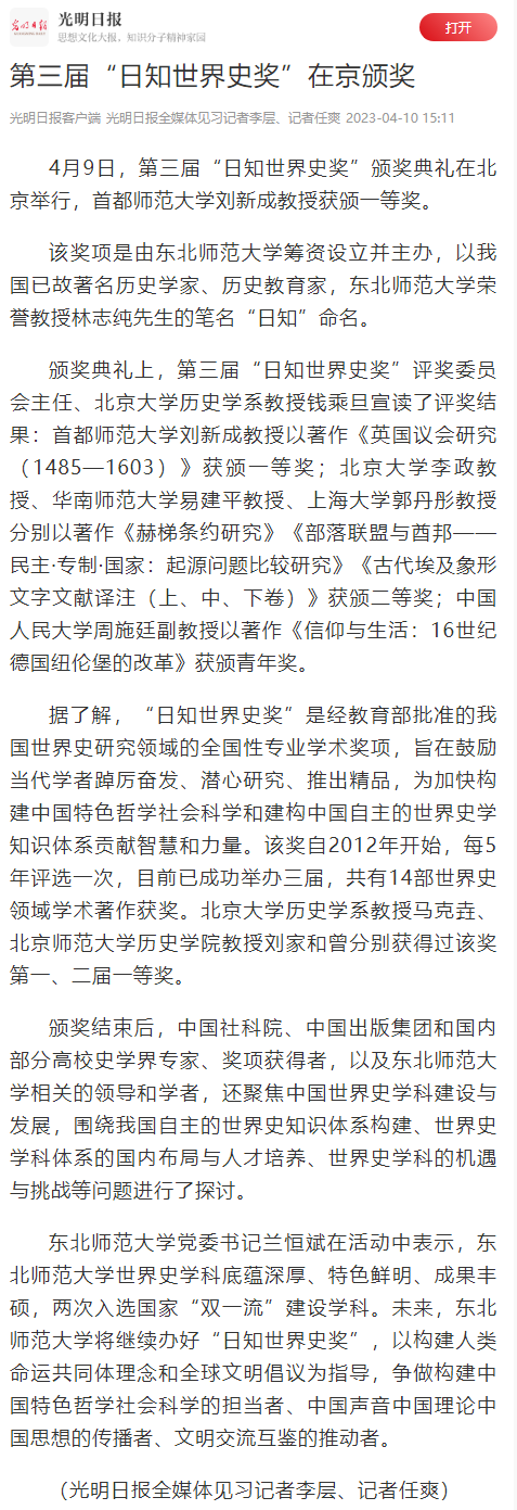 4月9日,由我校设立的“日知世界史奖”第三届颁奖典礼暨新时代首届中国世界史学科发展高端论坛在京举行。中央电视台、人民网、中国网、新华社客户端、光明日报客户端、中国教育报客户端等中央级媒体对该活动进行了深入报道。