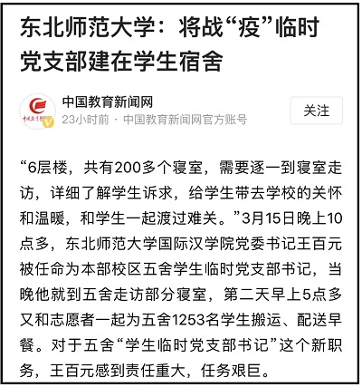 报道中指出,为了开展好疫情防控工作,从3月15日开始在校园内实行静态管理政策,学校党委决定在每个宿舍楼成立“学生宿舍临时党支部”,每个楼层还成立1个临时党小组,着力解决静态管理给学生带来的不便。临时党支部书记由已住进校内的学院(部)党委书记或者院长担任,学院(部)骨干辅导员担任副书记,党小组成员由学生党员、干部组成,同时担任学生志愿者。