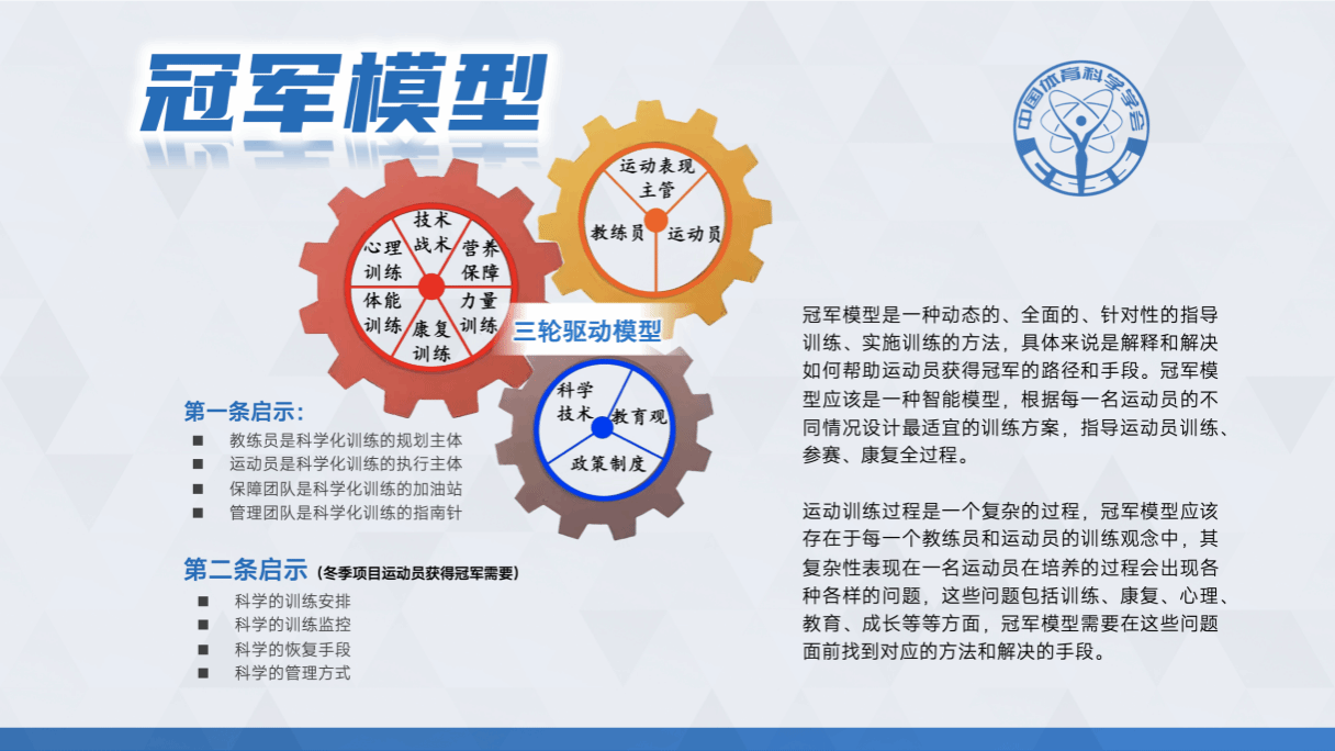 冠军模型是实验室最重要的核心目标,是一个三轮驱动的模型,是一种动态的、全面的、针对性的指导训练、实施训练的方法,帮助运动员获得冠军的路径和手段。冠军模型是一种智能模型,根据每一个运动员的不同情况设计最适宜的训练方案,指导运动员训练、参赛和康复全过程。