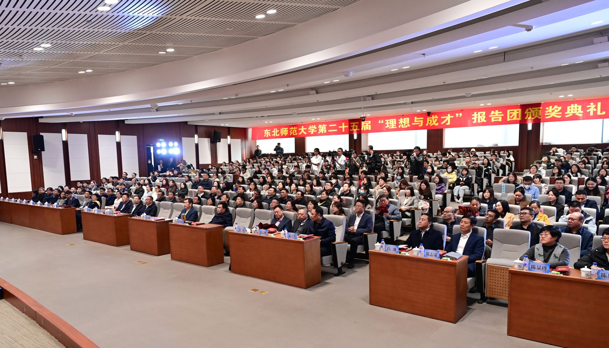 党委书记李忠军,校长徐海阳,党委副书记兼副校长常青,副校长薛利锋、邬志辉,党委副书记、纪委书记刘九庆,党委副书记庞立生,副校长严蔚刚,校长助理白冰、邵志豪出席本次活动。学校各机关部处、直附属单位主要负责人,各学院(部)党委书记、院长、党委副书记、学生代表,第二十五届“理想与成才”报告团成员及其导师和家长等400余人参加了现场活动。学校还邀请了第五届报告团成员王绍举、第六届报告团成员陈显玲、第七届报告团成员陈显红、第十九届报告团成员刘强作为往届成员代表参与活动并与学生交流。万余名师生、家长和校友通过线上收看典礼直播。
