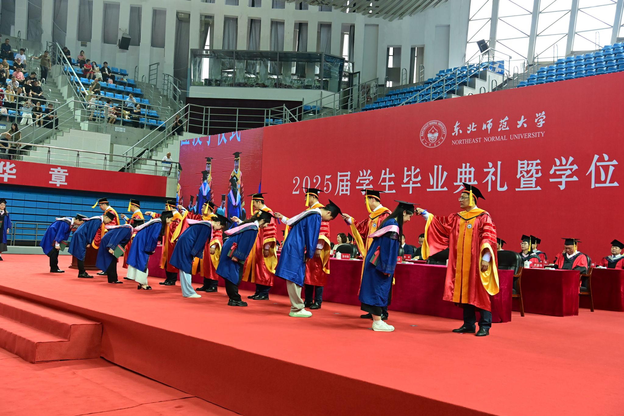 上午8:30,典礼在庄严的国歌声中拉开序幕。学校党委书记李忠军,校长徐海阳,党委副书记兼副校长常青,副校长薛利锋、邬志辉,党委副书记、纪委书记刘九庆,党委副书记庞立生,副校长严蔚刚,党委常委王娜、李红权、解玲,校长助理白冰,校学位评定委员会委员、校友代表、各单位主要负责人、各学院(部)党政班子成员和辅导员老师、毕业生亲友等参加了毕业典礼暨学位授予仪式。典礼由严蔚刚主持。
